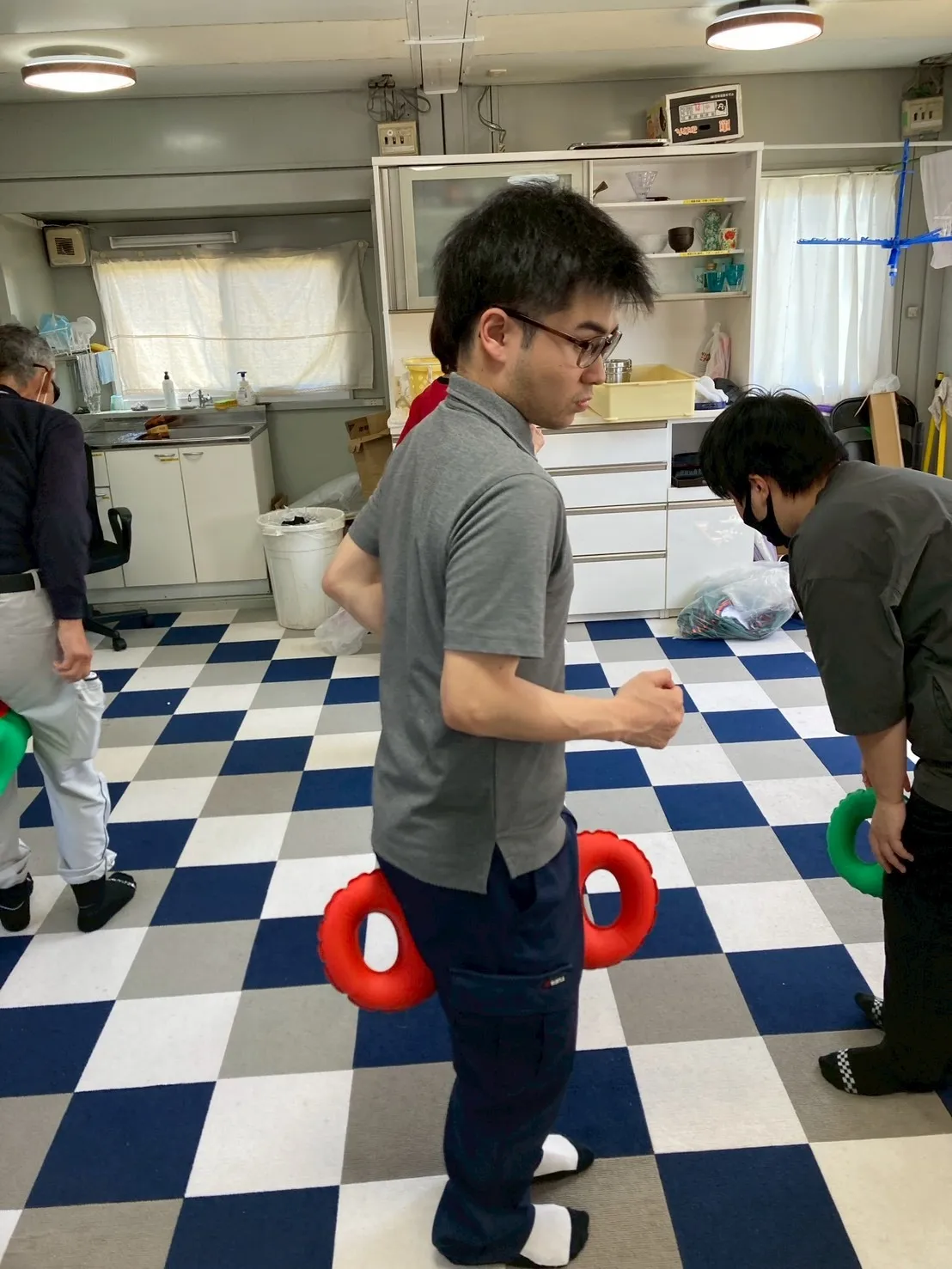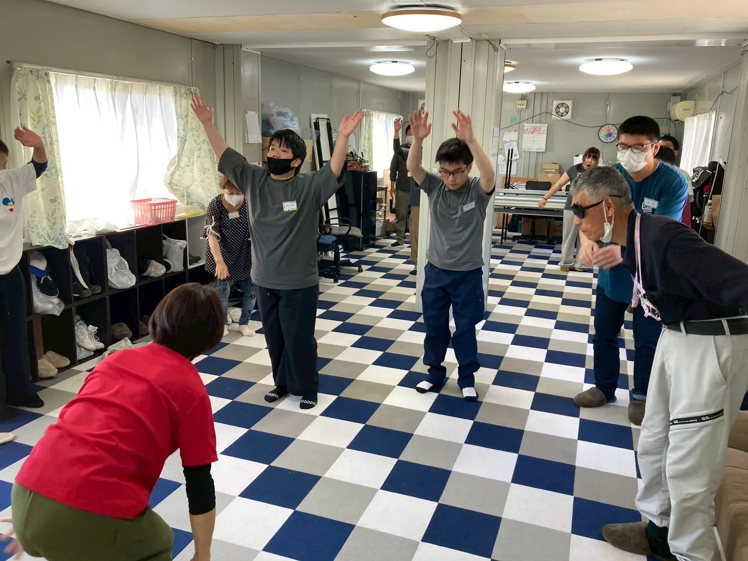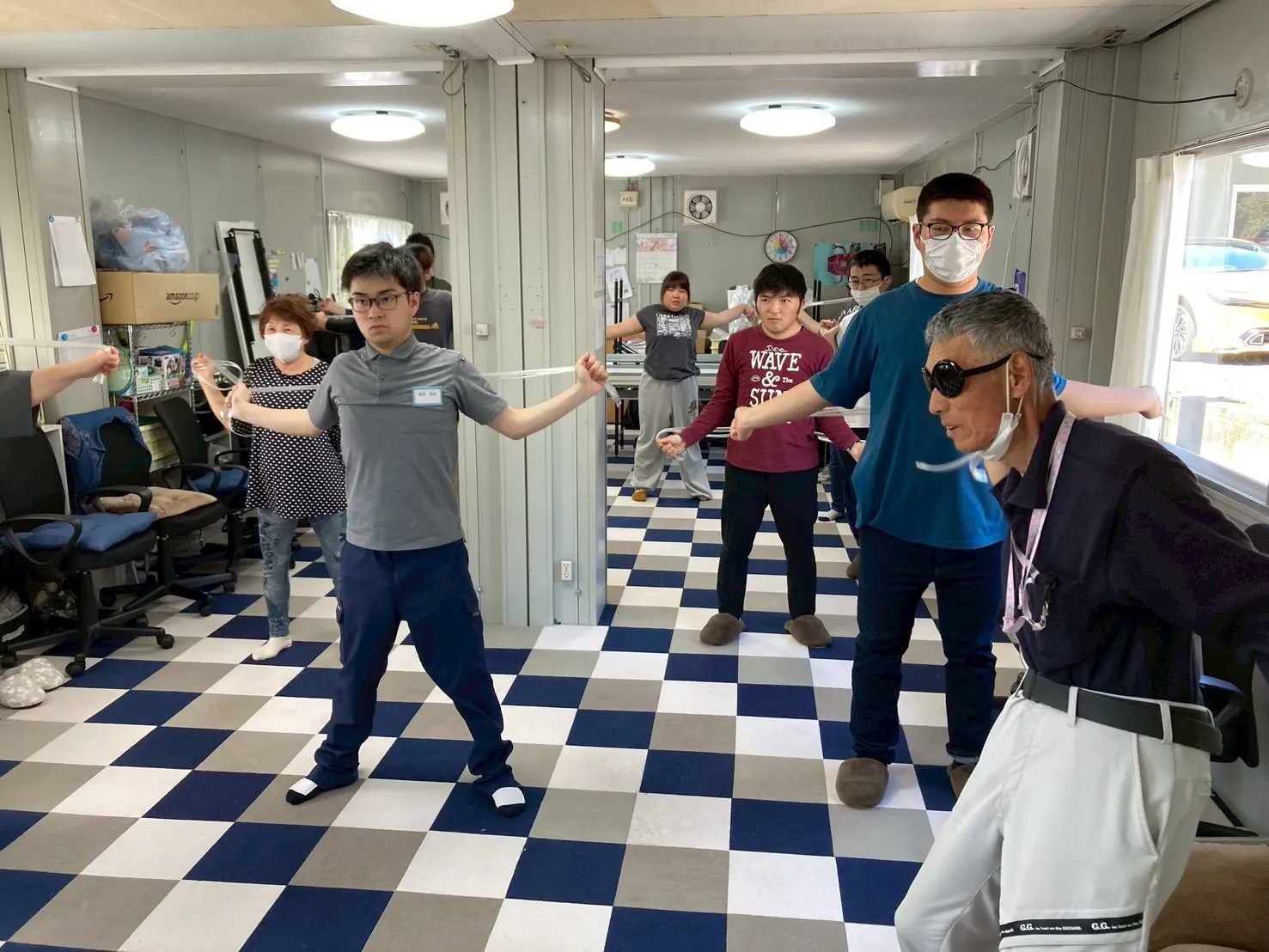 音楽に合わせて身体を動かしますが、日頃からあまり運動をしていない私は良い汗を流して若い従業員さんは元気に参加していました(よし)